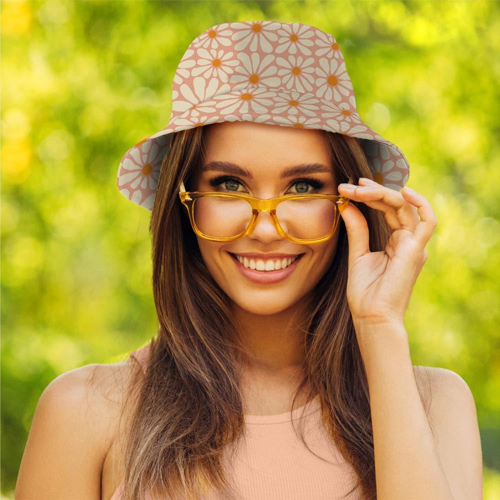 Fabriqué en coton et facilement ajustable, ce bob rose est composé d’un motif de pétales de fleurs beiges avec le centre orange.