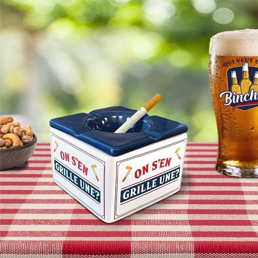 CENDRIER CARRE « ON S’EN GRILLE UNE? ». Découvrez notre nouveau cendrier carré « On s’en grille une ? ». Facilement reconnaissable avec ses couleurs et ses motifs, il deviendra rapidement un accessoire indispensable à votre table !