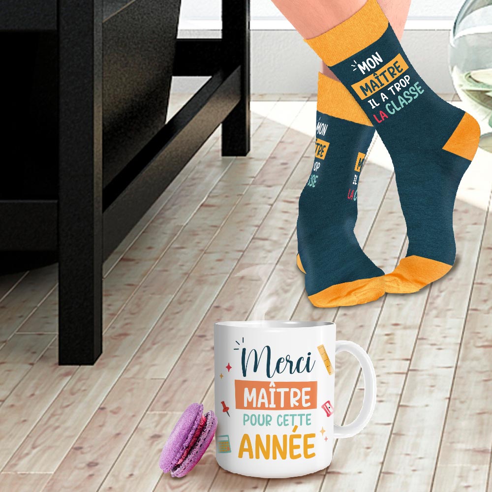 Le mug en céramique blanc comprend la mention colorée « Merci maître pour cette année » avec quelques petits dessins autour tels qu’une règle, une calculatrice et une punaise. Les chaussettes 100% coton sont bleus et jaunes avec la mention « Mon maître il a trop la classe ».