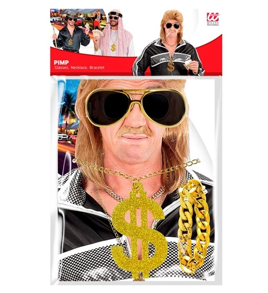 « MAC » (lunettes de soleil or, collier dollar or scintillant, bracelet or)