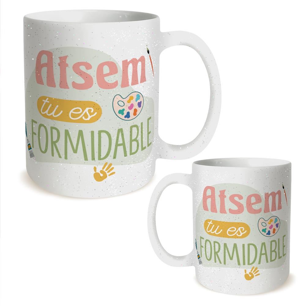 MUG A PAILLETTES ATSEM TU ES FORMIDABLE. Ce mug ATSEM est une idée cadeau idéale à offrir à une ATSEM en remerciements ou pour une occasion particulière.