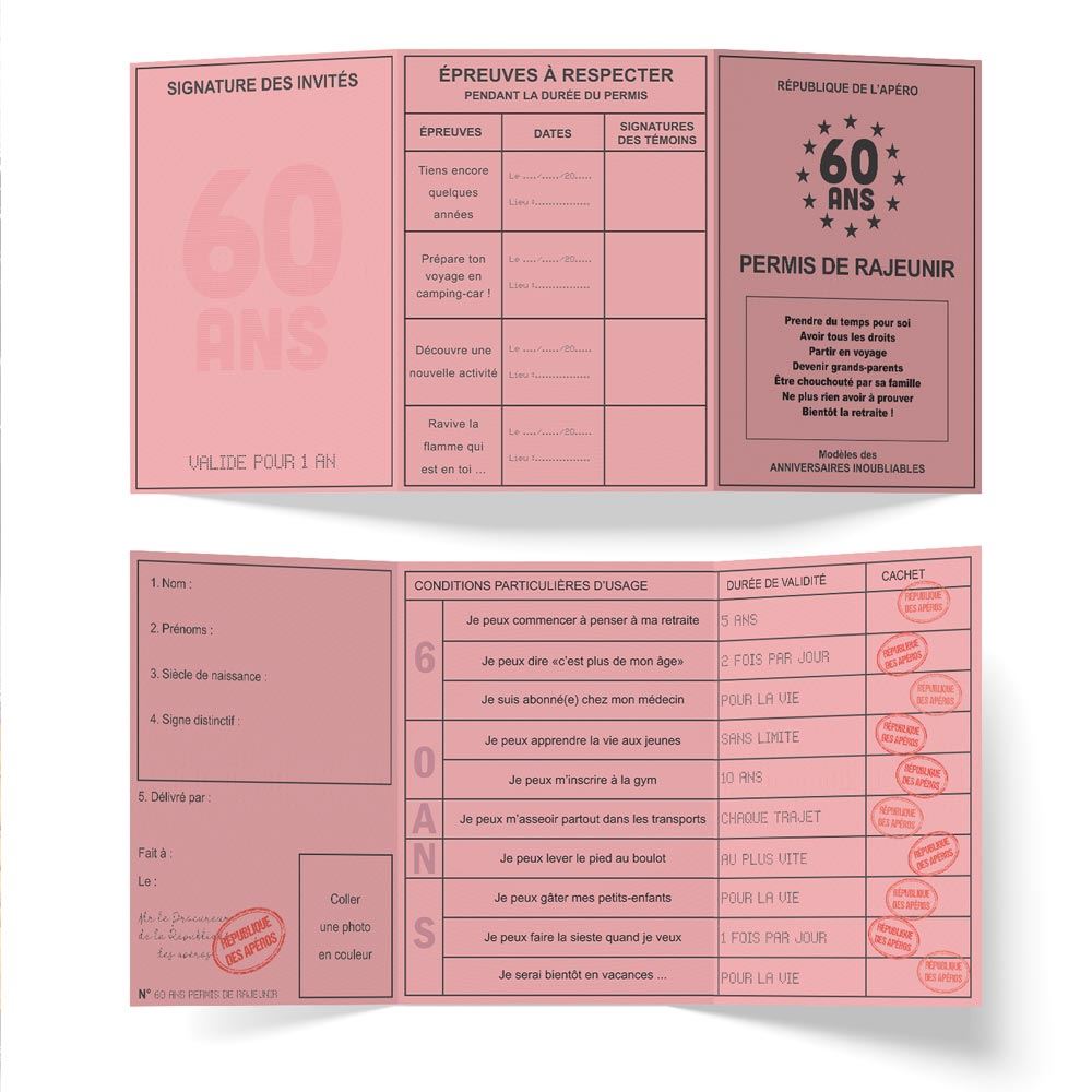 PERMIS 60 ANS « PERMIS DE RAJEUNIR ». Pour un cadeau humoristique à offrir pour fêter un 60e anniversaire, optez pour notre faux permis d’anniversaire 60 ans « Permis de rajeunir ».