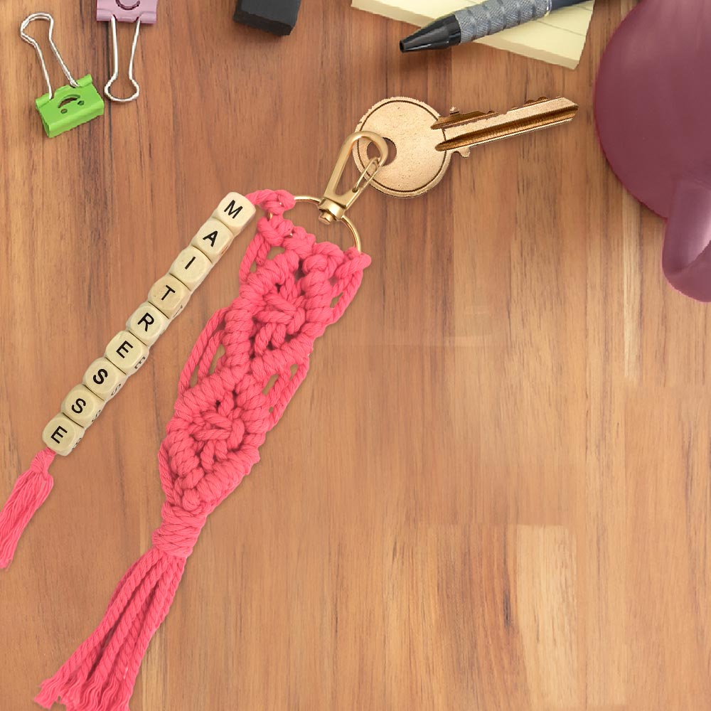 PORTE-CLES MACRAME MAITRESSE. Chic et fonctionnel, ce porte-clés macramé rose conviendra aussi bien pour orner un sac qu une paire de clés, Avec la mention » maîtresse ». Couleur rose. H, 19 cm/ L. 3 cm.